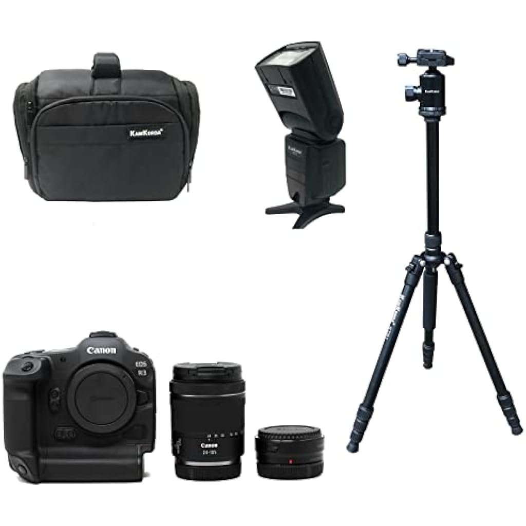 Camera Bag + Flash + Tripod + R3 Mirrorless Digital Camera + Adapter + RF 24-105mm f/4-7.1 24MP Full Frame CMOS Sensor, DIGIC X Image Processor, 0 Bit Internal Video Vertical Grip