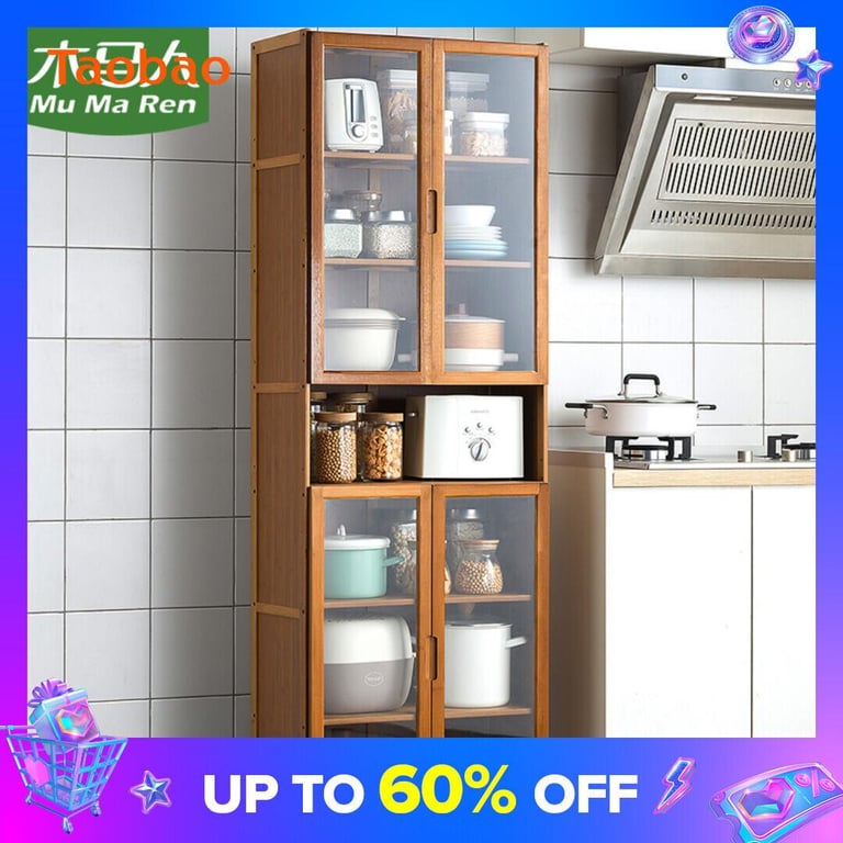 Kitchen Supplies Storage Cabinet Floor Multi-Layer Multi-Functional Storage Rack with Door Kitchenware Tableware Locker Bookshelf Wood