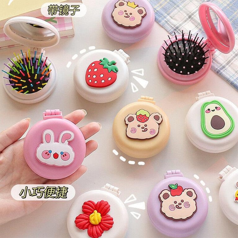2 in 1 Foldable Comb with Mirror Cartoon Cute Hair Brush Small Comb Mini Portable Air Cushion Comb Travel Pocket Size Comb