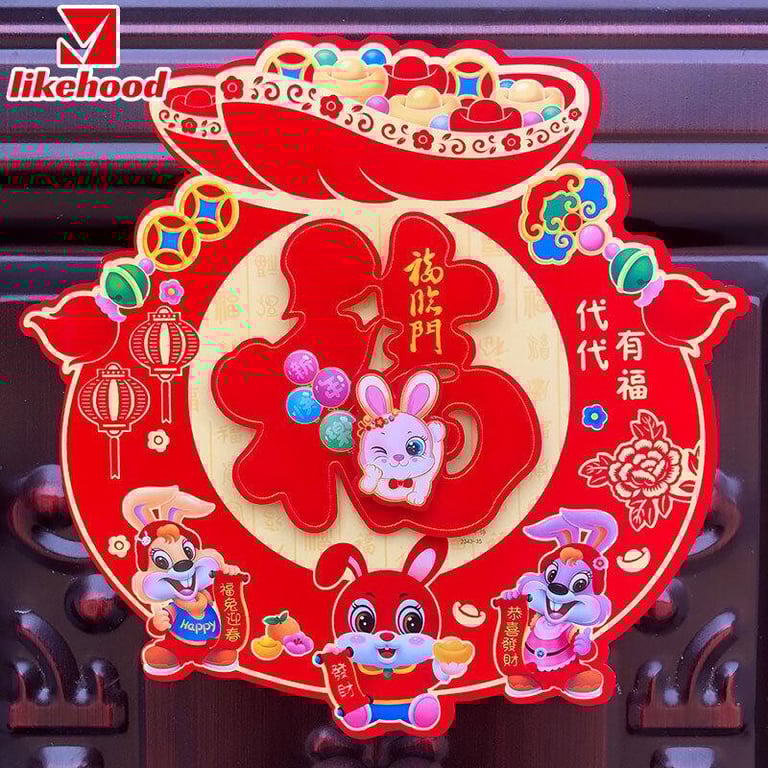 [Likelyhood] 1 Pair 2023 CNY Chinese Lunar New Year Rabbit Year Zodiac Sticker Paper-cut 3D Cartoon Blessing Door Window Sticker Flocking Fu Character Wall Couplet For Housewarming Spring Festival Party New Year Decals生肖门贴玻璃窗贴新年兔年家居装饰