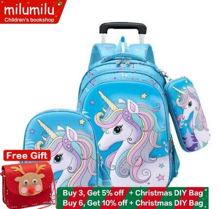 milumilu kids School Rolling backpack Bag set with lunch bag girls School Trolley Bag wheeled Backpack Children school rolling backpack