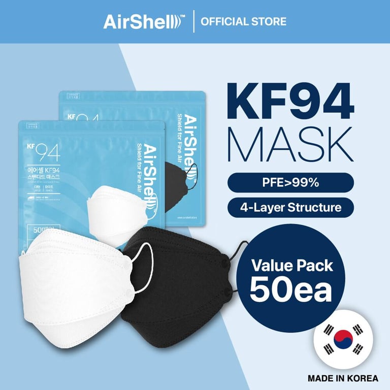 50pcs Value Pack AirShell KF94 Standard Mask 4ply MFDS Approved Black White For Adults Men & Women Made in Korea