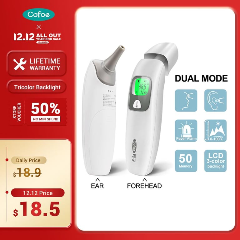 Cofoe 3 in 1 Ear & Forehead Infrared Thermometer Non-contact Temperature Sensor Scanner Digital Penembak Pengimbas Suhu Termometer Original on Hand LCD Heat Indicator Tri-color Backlight IR Home For Baby Child Adult Object Thermal Fever Measurement