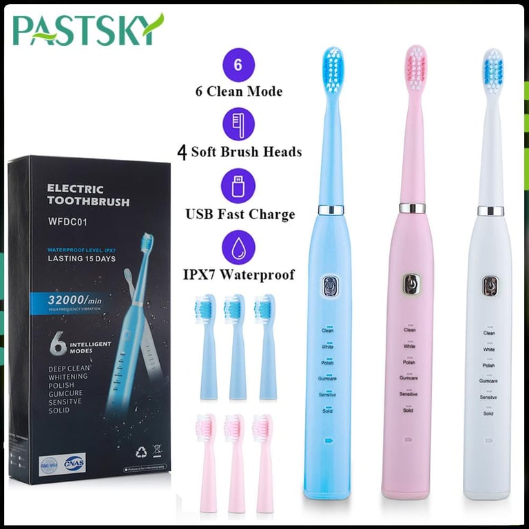 PASTSKY Electric Toothbrush Smart USB Rechargeable Tooth Brushes 6 Modes Waterproof Soft Bristles Gum Massaging for Adults Kids Teeth Cleaner