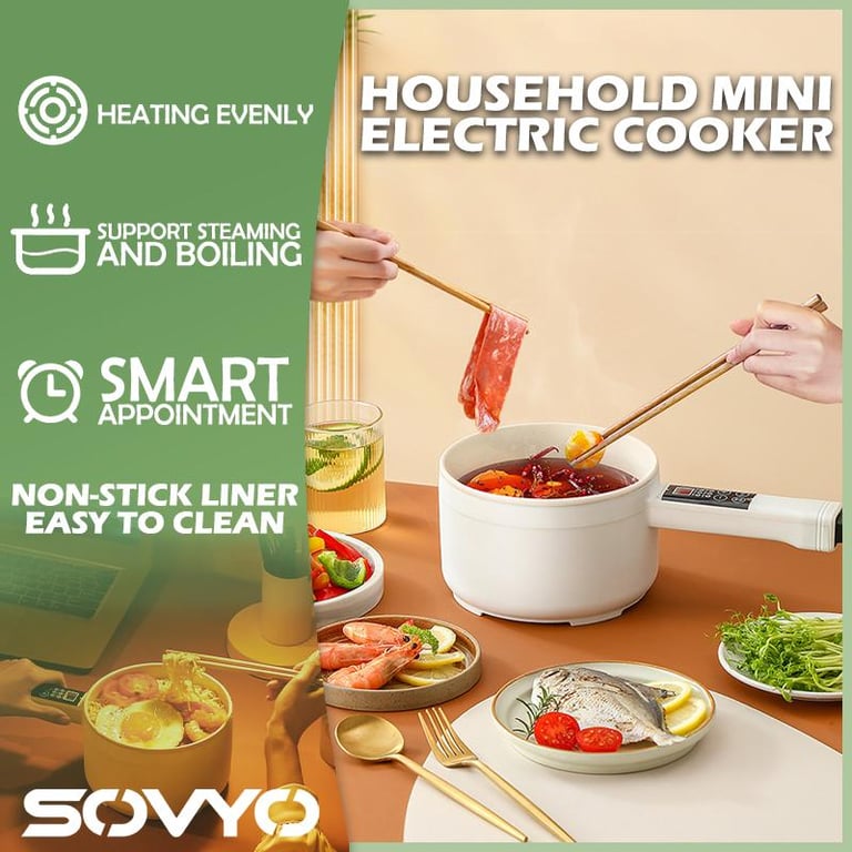 SOVYO 1.5L Multifunctional Rice Cooker Small Electric Hot Pot Steamer Dormitory Pot Vertical Non-Stick Omelette Pan Food Steamer Deep Fryer Cooking Pan Set with Ceramic Coated Glass Lid