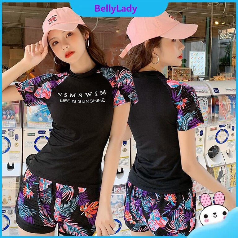 2 Pcs/set Women Swimming Suit Sunscreen Swimsuit Short-sleeve Top+ Flat-angle Skirt
