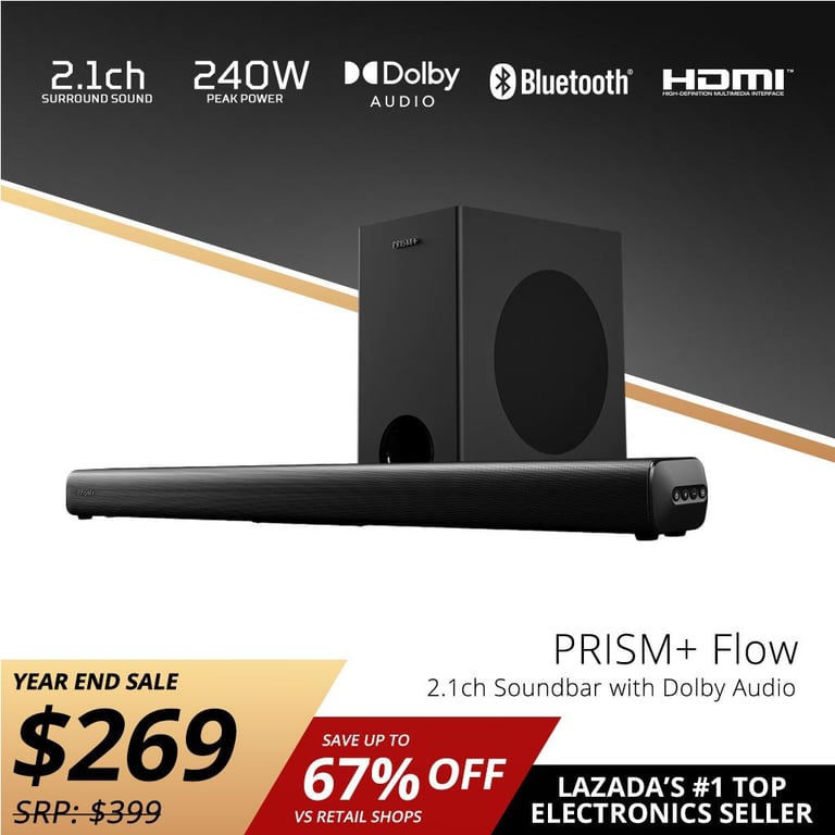 PRISM+ Flow 2.1ch Soundbar with Dolby Audio | 240W | Wireless Subwoofer | Wireless Music Streaming | Bluetooth 5.0