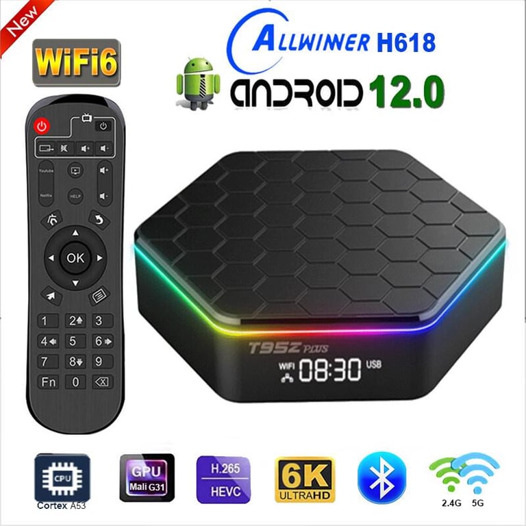 New T95Z PLUS Android 12 TV Box Allwinner H618 Quad Core Cortex A53 6K HD 2.4G&5G WiFi6 Bluetooth 4GB 32GB 64GB 6K Ultra HD VP9 with RGB Light Smart Media Player Support Voice Assistant 2022 Set Top Box