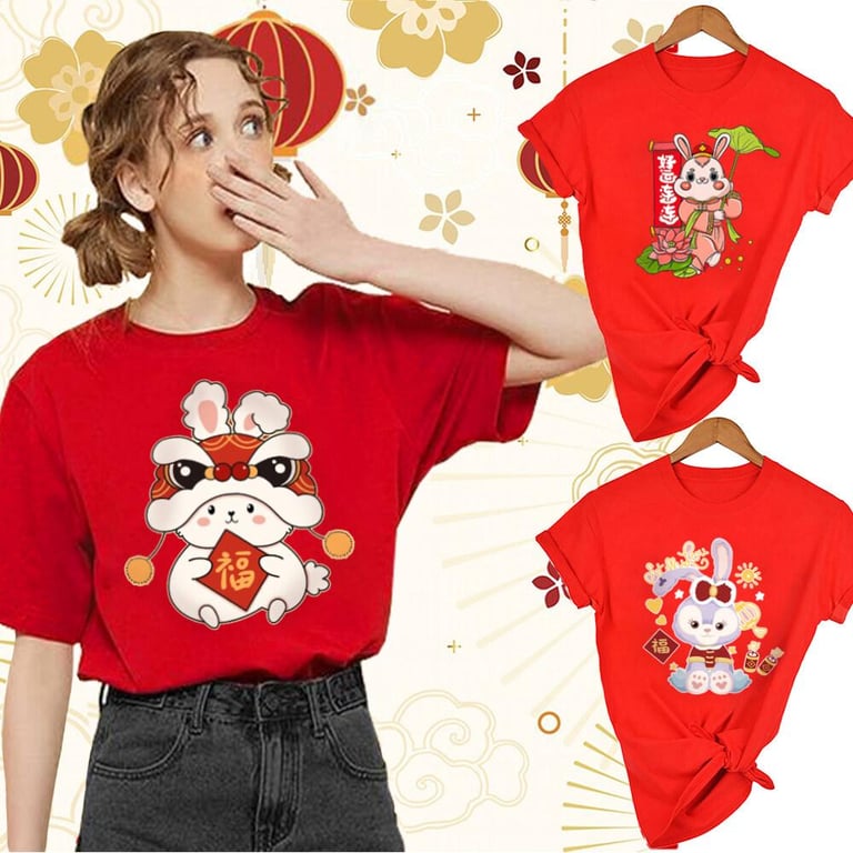 Cute Rabbit Women T-shirt Cny T Shirt Fashion Red Tshirts Teen Girls Tshirt 2023 Chinese New Year Party Clothes 兔年新年衣服 Gift