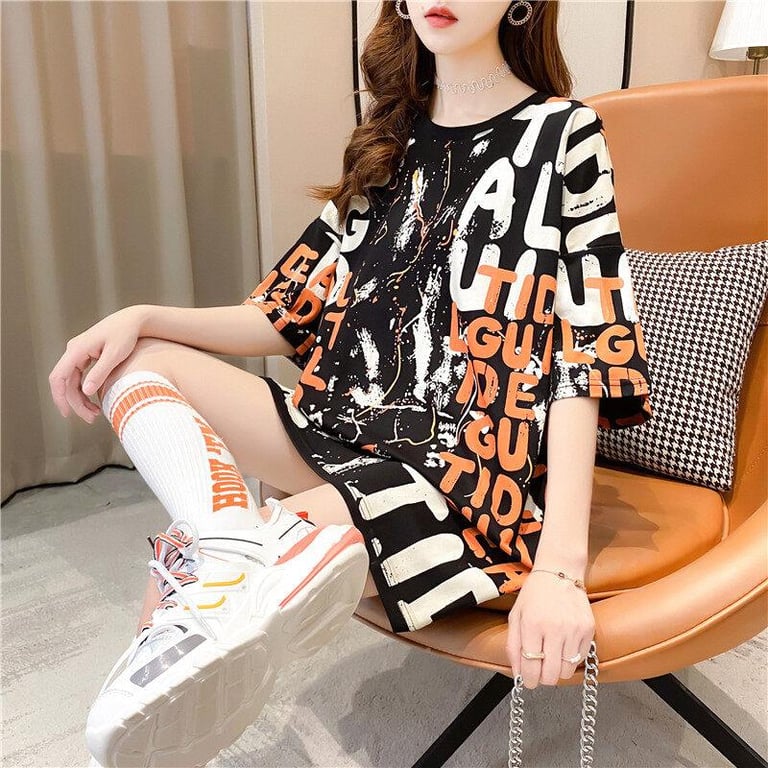 Women Clothes Summer T-Shirt Plus Size Loose Mid-length Blouse Letters Print Cute Sweet Korean Style Casual Round Neck Short Sleeves Shirt