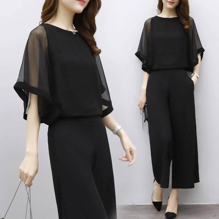 ICHOIX 2019 Large size women's dress Fat mm Loose Chiffon Top+Pants black Nine-cent Pants Two Aets of Summer Fat sister Suit