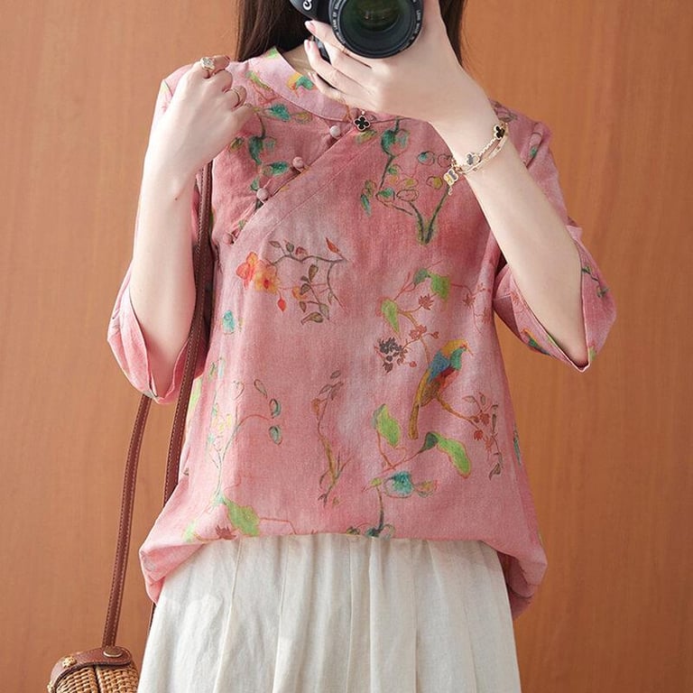 Women's Cotton and Linen Shirt with Chinese-Style Crossbody Buckle Summer Loose Half Sleeve Linen Cheongsam Shirt Top Zen Tea Clothes