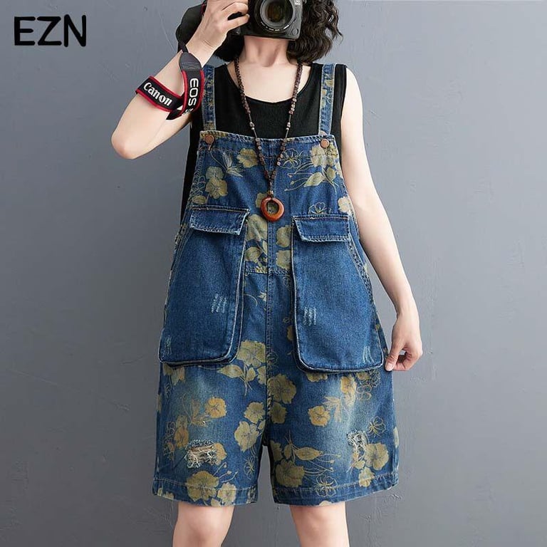 EZN Plus Size Denim Jumpsuits for Women Printed Wide Leg Knee Length Jeans for Women 6503