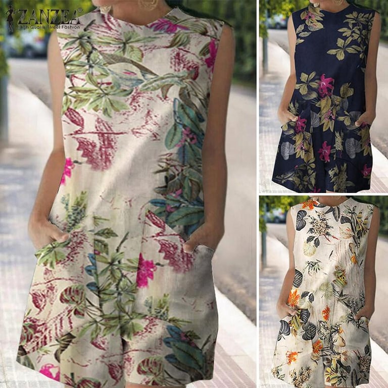 Rulfepy ZANZEA Women Cotton Jumpsuit Floral Casual Holiday Crew Neck Sleevesless Jumpsuit Romper