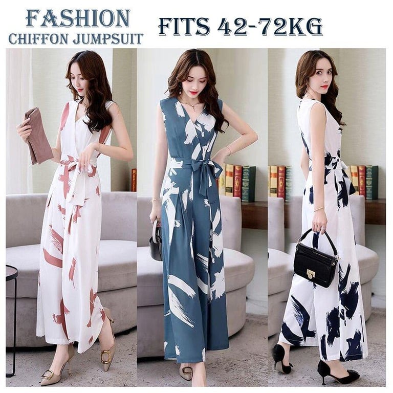 Jumpsuit for Women's 42-72KG 2022 Summer New Fashion Style Floral Printed Light Mature Wide Leg Pants V-neck sleeveless inelastic Spot goods Single-layer nylon fabric smooth