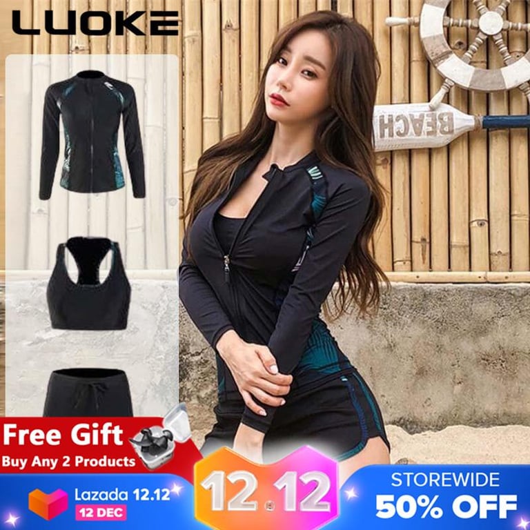 Luoke High Quality Women Swimsuit Professional Three Piece Korean Fast Dry Sunscreen Swimming Surfing Black
