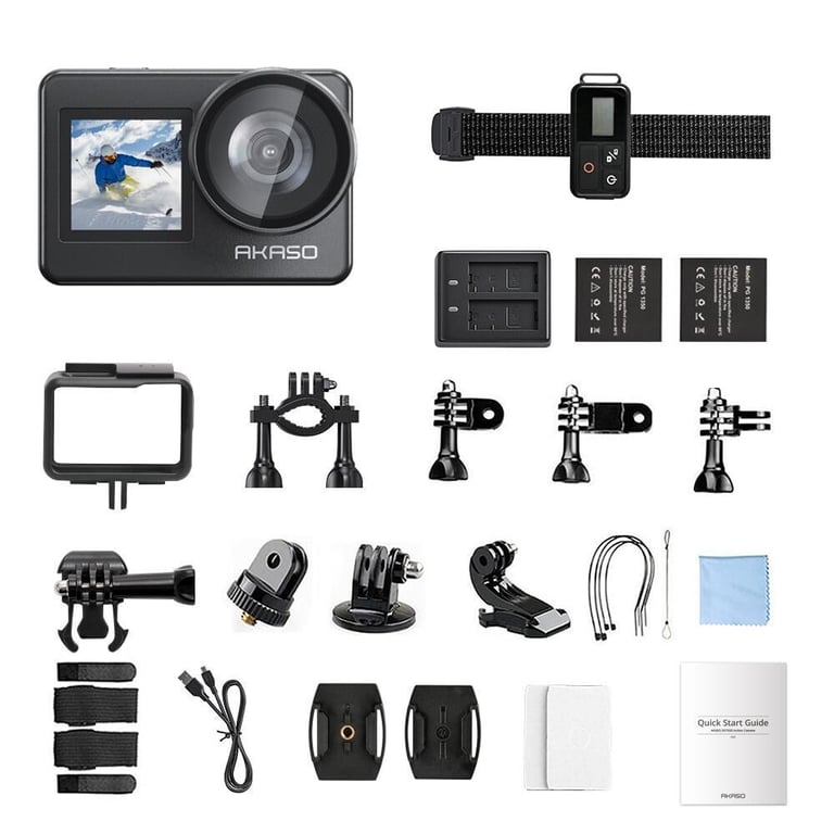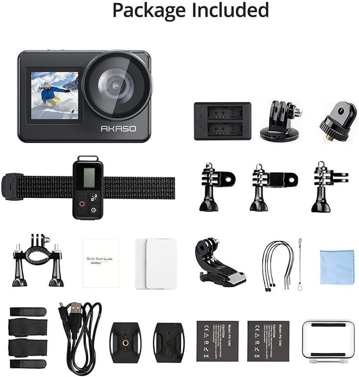 1x AKASO Brave 7 Action Camera/ 1x Remote Control/ 2x 1350mAh Battery/ 1x Camera Frame/ 1x Battery Charger/ 1x Bicycle Stand/ 6x Mount/ 2x 2-sided tape/ 2x Helmet Mount/ 1x Bandages/ 5x Tethers/ 1 x Protective Backdoor/ 1x USB Cable/ 1x Lens Cloth/ 1x Quick Reference Guide