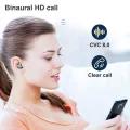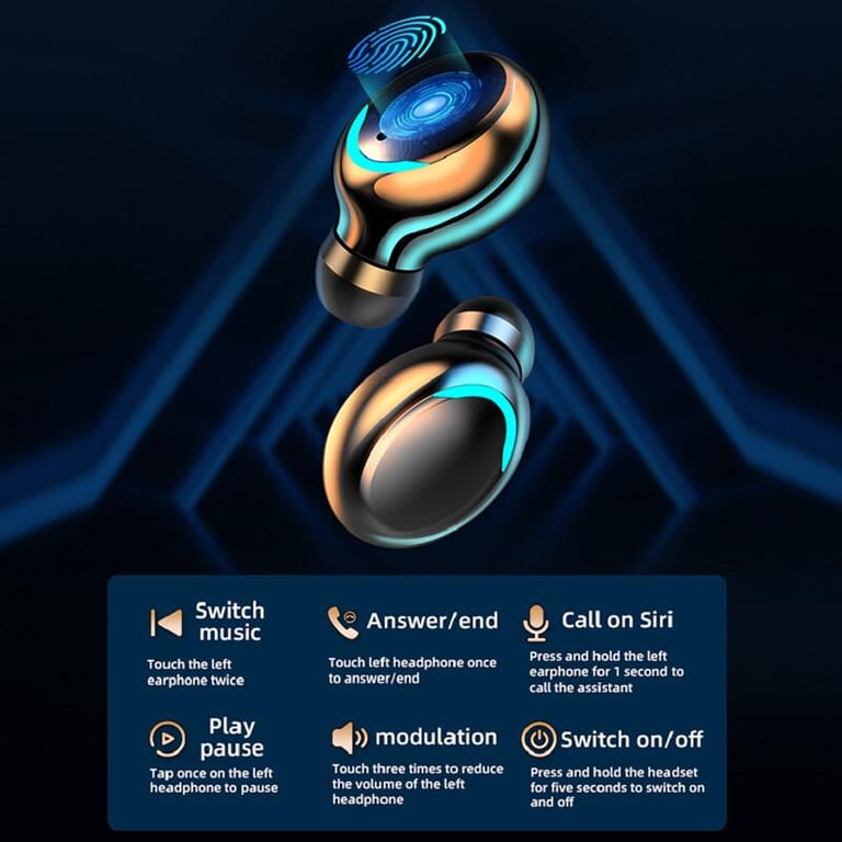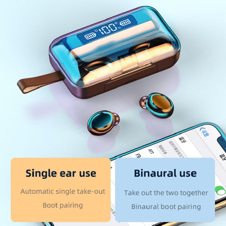 1. Take the earphones out from the charging bin, press and hold the left and right earphones multi-function button for 3 seconds to turn on until the red and blue lights flash alternately, enter the earphone searching state.
