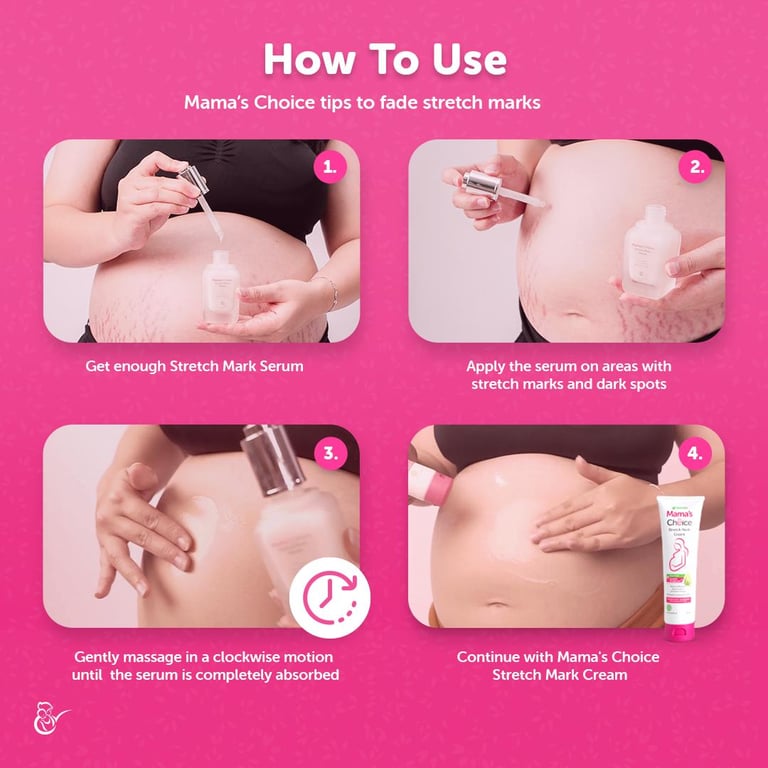 How To Use the Stretch Mark Treatment Series:\n1️⃣Use Mama's Choice Stretch Mark Serum to help brighten & regenerate deep into the skin