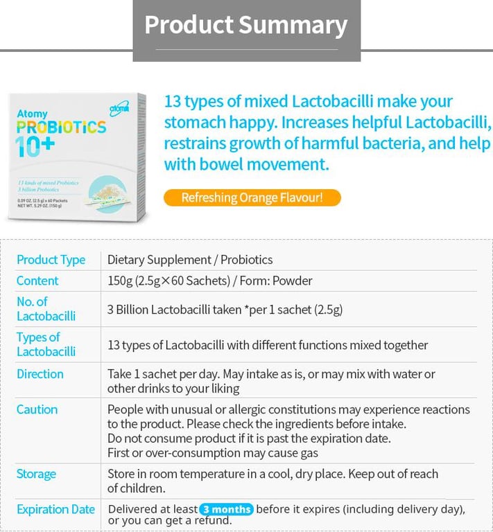 12 types of mixed Lactobailli make your stomach happy. Increases helpfful Lactobacilli, restrains growth of harmful bacteria and help with bowel movement.