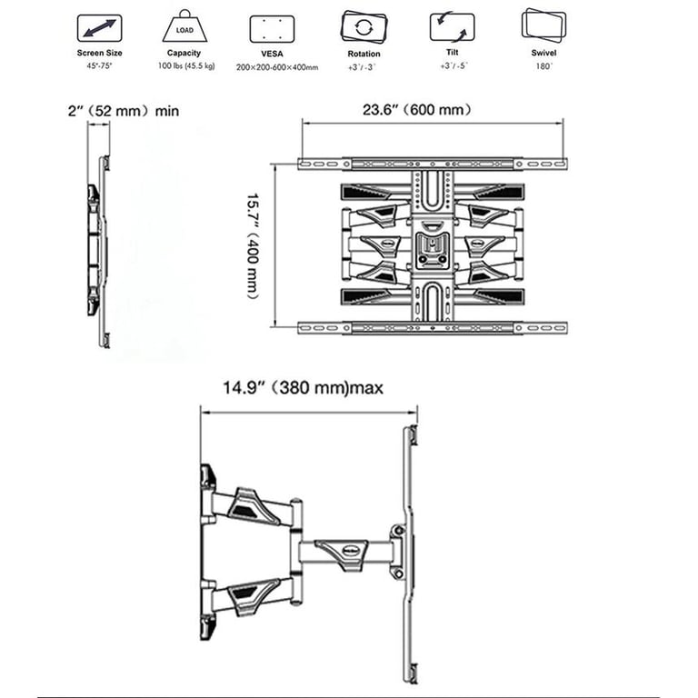 🔥This advanced design makes achieving the proper viewing angle easy and convenient. The cable management system makes your cable connections straightforward and neat. The standard accessories enable you to extend the VESA TV mount holes from 400x400, 600x400mm. The arm can extend to a maximum of 496mm.