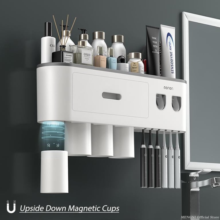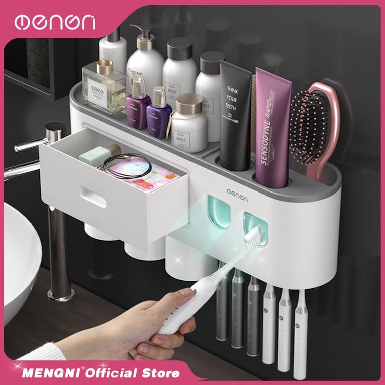 MENGNI 2 in 1Multi-Functional Toothbrush Rack Automatic Toothpaste Squeezer Dispenser Bathroom Organizer Rack Waterproof Counter Storage Box Bathroom Accessories Sets