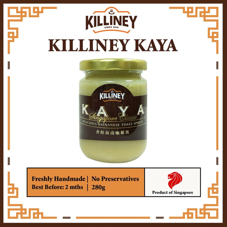 Kaya is Singapore's take on coconut jam, with the perfect blend of eggs, coconut milk, fresh pandan leaves and sugar. This jam has since evolved over the generations to become a Singapore local delicacy. Kaya at Killiney is handmade daily to ensure its freshness and quality.