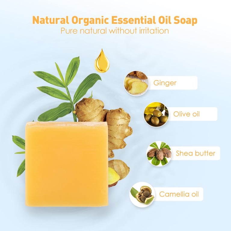 • Ginger Soap: The main ingredient is ginger essential oil, which deeply cleanses the skin, removes dirt and impurities, effectively resists oxidation, and makes the skin healthier.