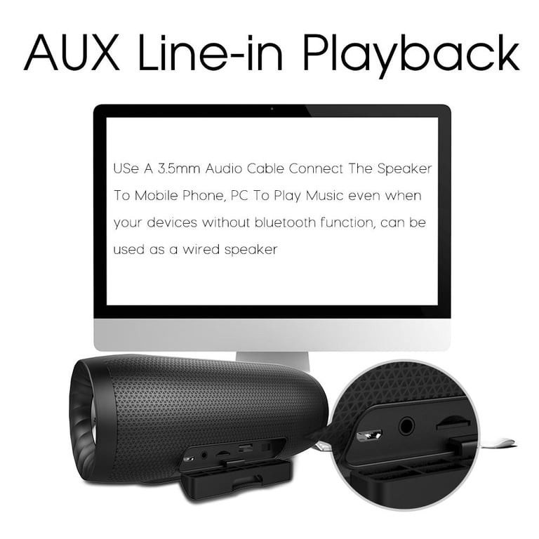 \n3)​​​​. Support AUX Line-out Music Play Mode, USe A Standard 3.5mm Audio Cable Connect The Speaker To Mobile Phone Or Tablet PC To Play Music even when your devices without bluetooth function, can be used as a wired speaker.