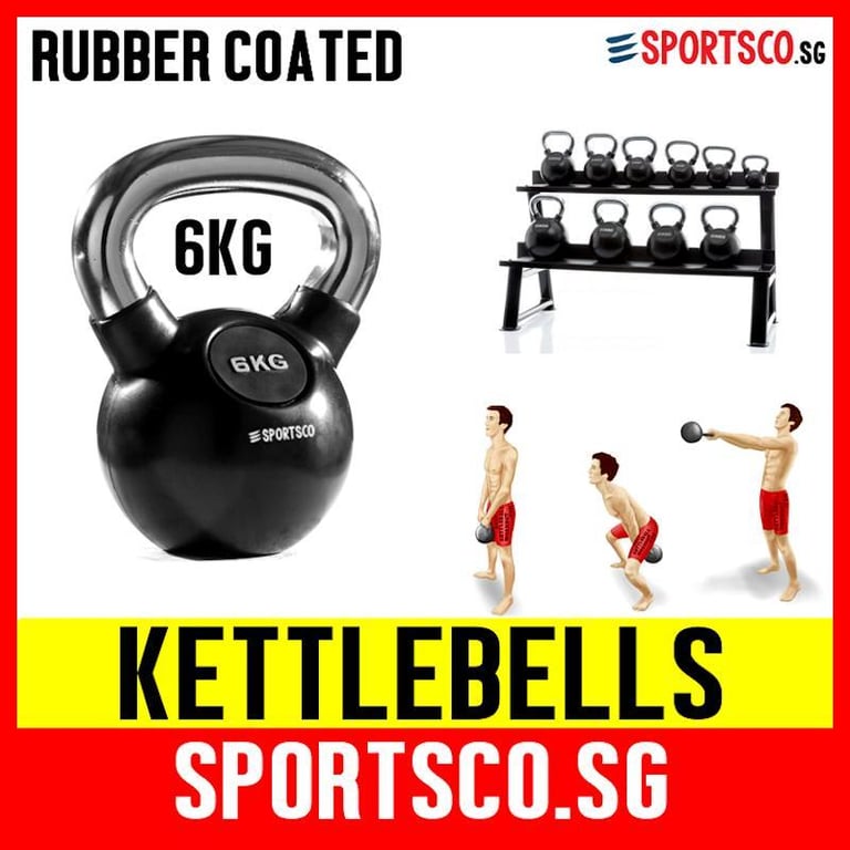 SPORTSCO 6KG Rubber Coated Kettlebell - Smooth Chrome Metal Handle - Alternative Weights Exercise to Dumbbells - Shipment from Singapore