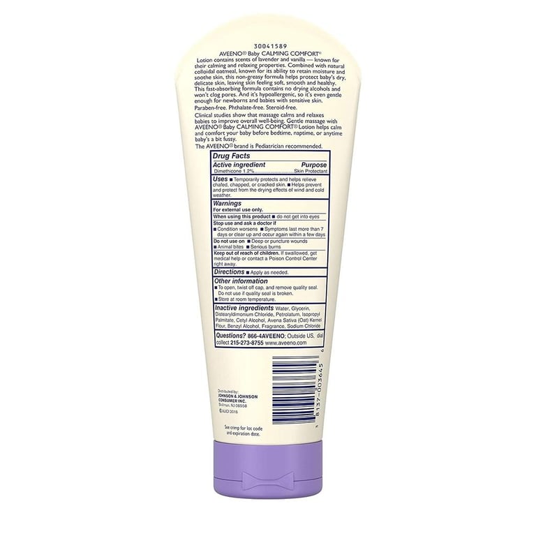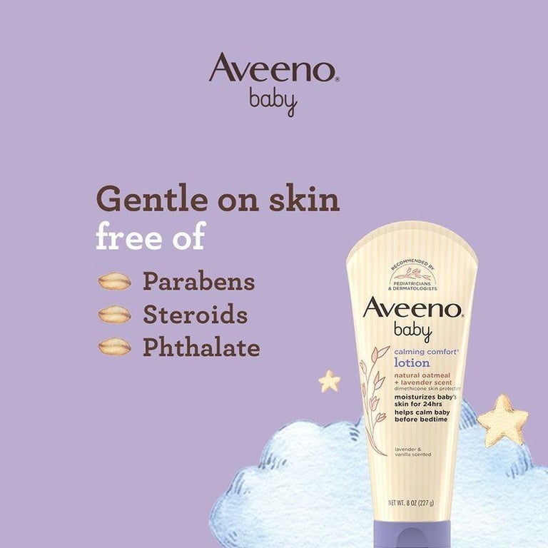 Aveeno Baby Calming Comfort Lotion contains scents of lavender and vanilla, known for their calming and relaxing properties, ideal for bedtime. After a warm bath with Aveeno baby Calming Comfort Bath, gently massage your baby with lotion to keep skin smooth. This moisturising lotion helps protect baby's dry, sensitive skin. Combined with natural colloidal oatmeal, known for its ability to retain moisture and soothe skin, to keep your baby's skin feeling soft and moisturised for 24 hours.