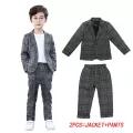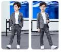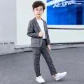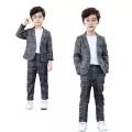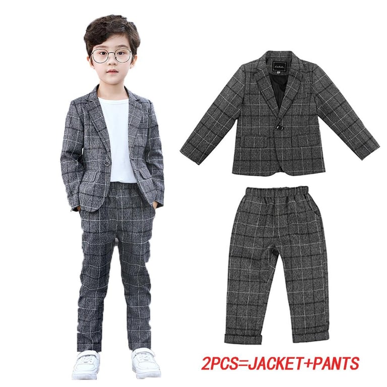 2Pcs (Blazer +Trousers ) / 3Pcs (Blazer +Trousers+White T-shirt ) Boys Gentleman Plaid Suit Kids Gray Formal Wear Children Jacket Pants T-shirt Clothes Party Sets for 3-11 Years