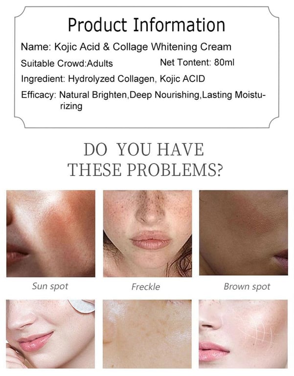 - <p><span style="font-family: times new roman;font-size: 16.0px;">Name:Kojic Acid & Collage Whitening Cream</span></p><p><span style="font-family: times new roman;font-size: 16.0px;">Suitable Crowd:Adults</span></p><p><span style="font-family: times new roman;font-size: 16.0px;">Net Tontent:80ml</span></p><p><span style="font-family: times new roman;font-size: 16.0px;">Ingredient:Hydrolyzed Collagen,Kojic ACID</span></p><p><span style="font-family: times new roman;font-size: 16.0px;">Efficacy:Natural Brighten,Deep Nourishing,Lasting</span><span style="font-size: 16.0px;display: inline;"><font face="Times New Roman">Moisturizing</font></span></p>