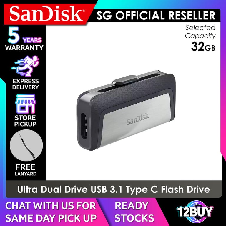 SanDisk Ultra Dual Drive USB 3.1 Type C Flash Drive 150MB/s Read Speed 60MB/s Write Speed 16GB 32GB 64GB 128GB 256GB DC2 12BUY