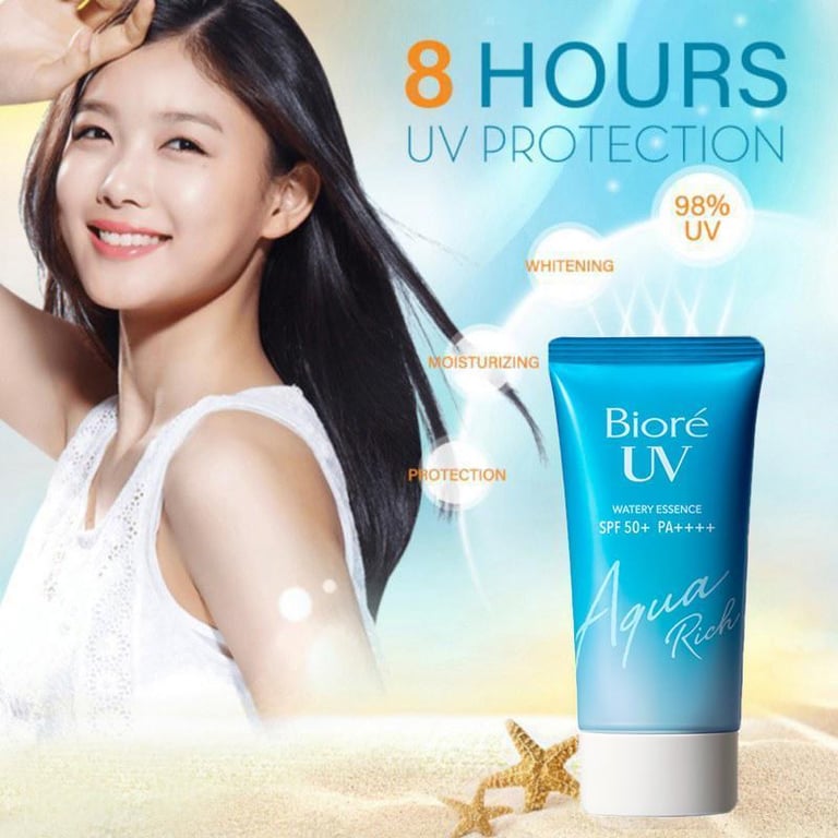 Biore UV Aqua Rich Essence SPF 50 + PA ++++:Recent innovations from Japan Ultra-lightweight waterproof formula for maximum protection. * Multiply 2 ** with new formula waterproof and sweat.