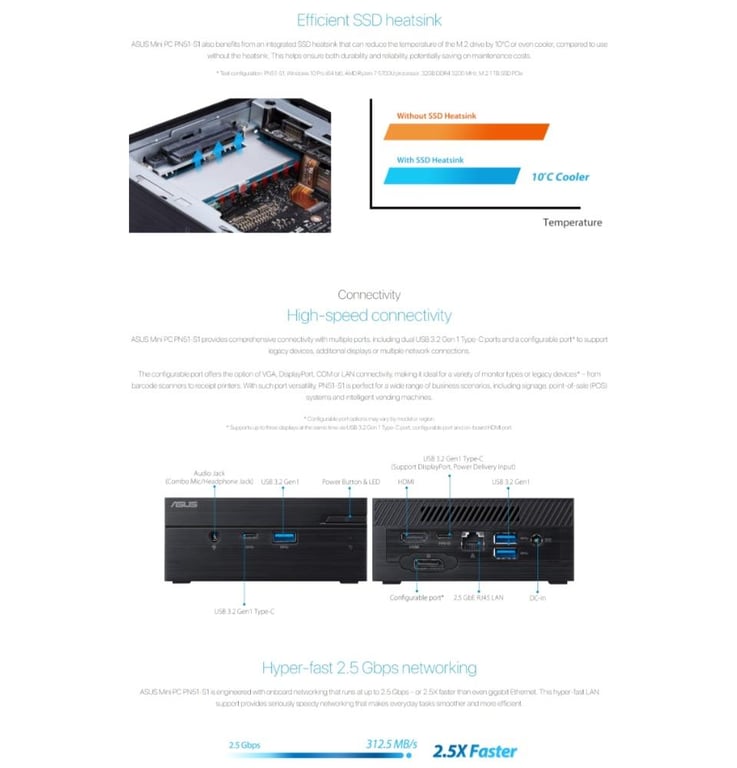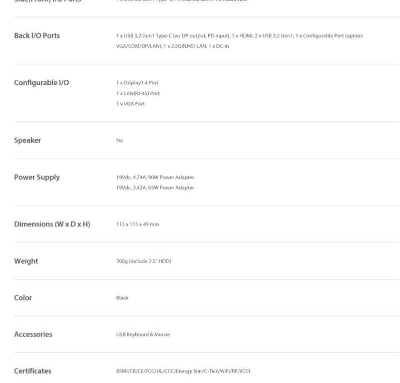 Back I/O Ports : 1 x USB 3.1 Gen 2 Type-C / 2 x USB 3.1 Gen 1 Type-A / 1 x HDMI / 1 x 2.5G LAN / 1 x DC-in / 1 x Configurable port(DisplayPort)
