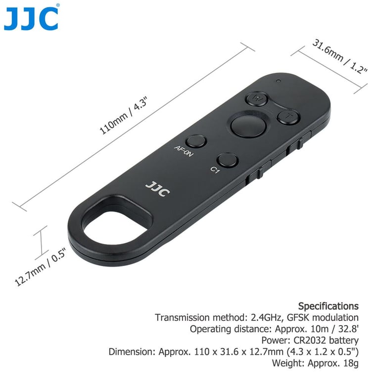 The JJC BTR-S1 Wireless Remote Control is specially designed for select Sony cameras. It allows you to remote your camera wirelessly with an operating distance of approx. 10m / 32.8' in any direction. The BTR-S1 can be used for shooting still image, recording video, adjusting camera focus, zooming the camera and activating the camera's C1 or AF-ON function. You can disable all the buttons on the remote control in order to prevent unintentional operations while you carry it around by sliding the LOCK switch to the "LOCK" position. The remote is portable and you can put it in your pocket or hang it on your key ring. It is powered by a CR2032 battery (included). JJC BTR-S1 replaces Sony RMT-P1BT remote commander.
