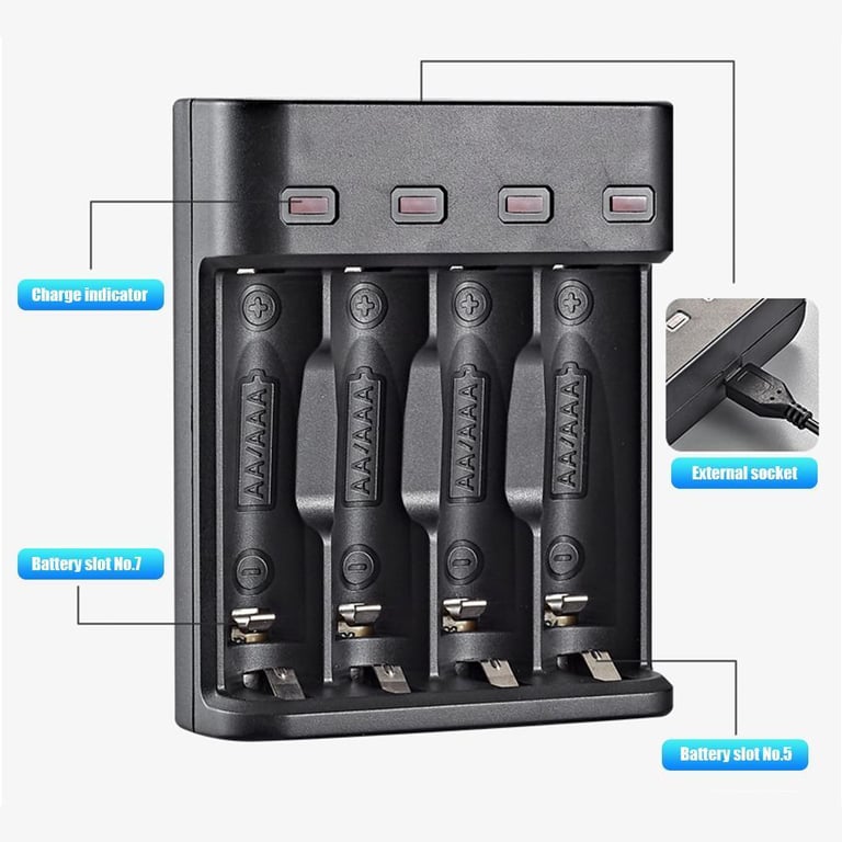 Specifications: Product Number: BH-804U Input Voltage: DC 5 V 1-2 A Output voltage: DC 4 X AA 1.2 V 300 mA, DC 4 X AAA 1.2 V 200 mA Product Features: IC Intelligent control, full power auto stop and light off, lamp independent charging Product Certification: EU CE/EMC, US FCC Net Weight: 39.2 g (excluding USB charging cable) Gross Weight: 54.2 g (including USB cable with package) Product Size: 62 X 7 X 25 mm/2.44 X 0.28 X 0.98 Package size: 150 X 100 X 80 mm/5.91 X 3.94 X 3.15''