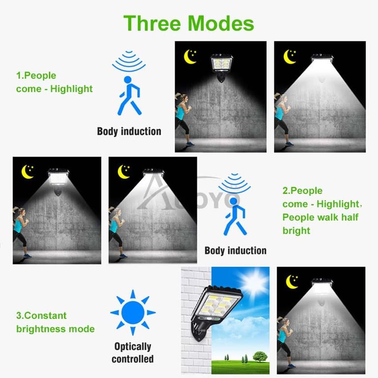 - 3 Intelligent Lighting Mode:Turn ON/OFF mode: people come,lamp on. people left, lamp is off under darkness;Dim light mode: people come,lamp on. people left, lamp is dim lighting under darkness;Steady on mode: people come and leave, lamp always is on under darkness.