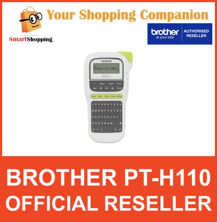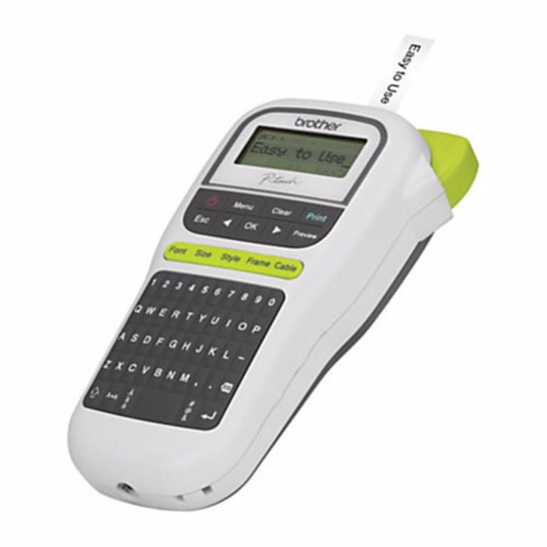 Portable P-touch label maker great for home, home office and on-the-go use. Features a QWERTY keyboard, convenient one-touch keys and an easy-view display to preview your labels before printing. Easily personalize your labels with 3 fonts, 14 frames, and over 250 symbols. Also organize your wires and cables with the useful cable labeling feature. Creates labels with 1 or 2 lines of text. Built-in memory stores up to 15 labels for fast reprinting. Uses durable, laminated easy-peel "TZe" tape up to 12mm (~1/2") wide. Powered by 6 AAA batteries or optional AC adapter (each sold separately). Includes 12mm starter tape.