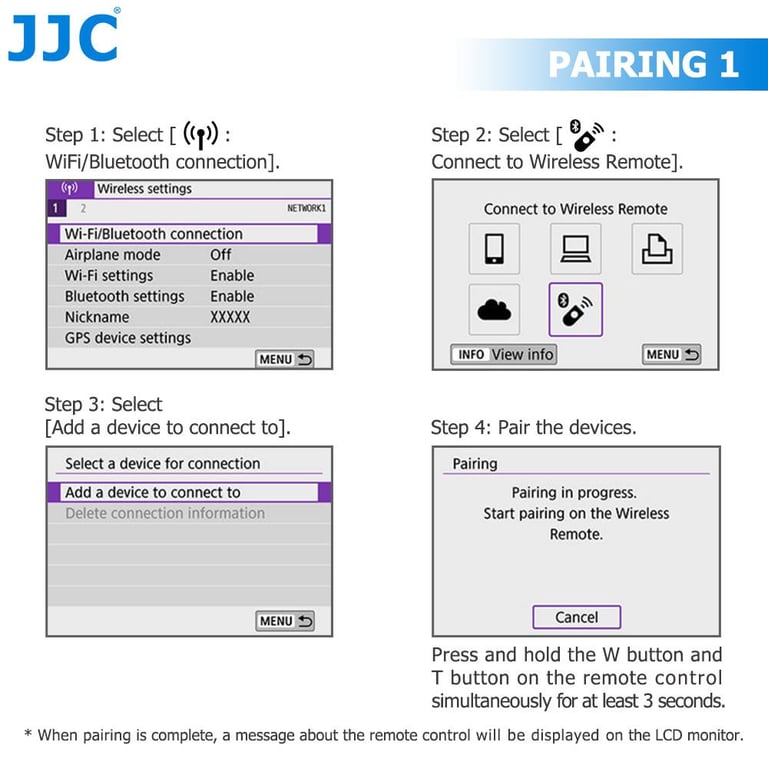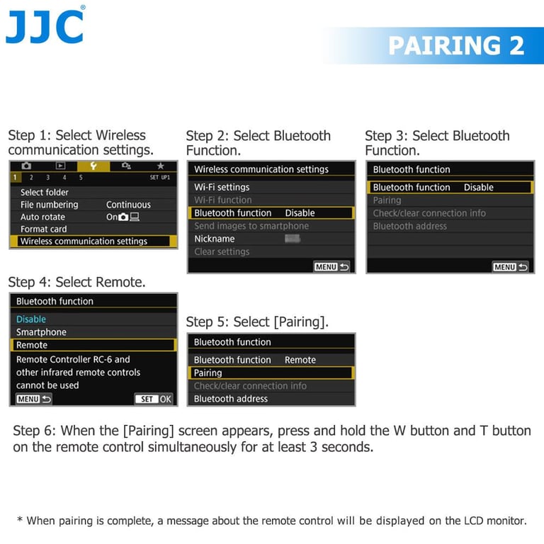 (1) Enable Bluetooth in camera menus (Menu - Setup tab - Wireless communication setting - Bluetooth function - Remote)\n\n(2) Select "pairing"\n\n(3) Hold down both the W and T zoom buttons on the remote simultaneously for more than 3 seconds\n\n(4) When the camera asks if you'd like to pair with the remote, tap "OK"