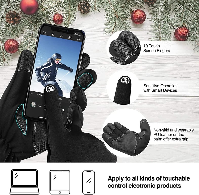 TAKE PICTURES & SHARE WITHOUT DROPPING THE PHONE - 10 high sensitive touchable Fingers of men gloves for cold all work for screen touching with larger non-slip PU conductive leather. Answer phones, texting, taking pictures, sensitively operate touchscreen device without taking off the winter warm gloves. Fingertips and palms have large no-slip, silicone print for driving, cycling and grabbing. The winter thermal gloves brings safety and convenience as well as warmth and comfortable.