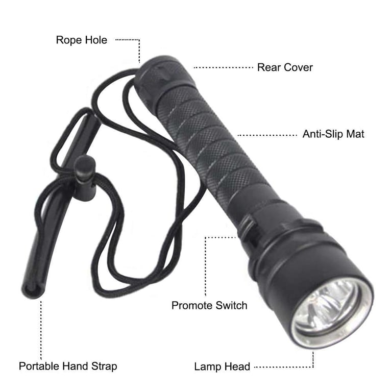 Feature:\n\n\tThis LED Flashlamp has 3pcs XML-T6 / L2 LED. Can irradiate longer distance than some other LED Flashlight.\n\n\tIt has IP68 waterproof grade, can work btter than some other LED Flashlight under the water.\n\n\tIt can be used for diving,camping,night hiking,night hunting,night working\n\n\tPlease use clean water to wash the flashlight after diving.3x Cree XML-T6LED