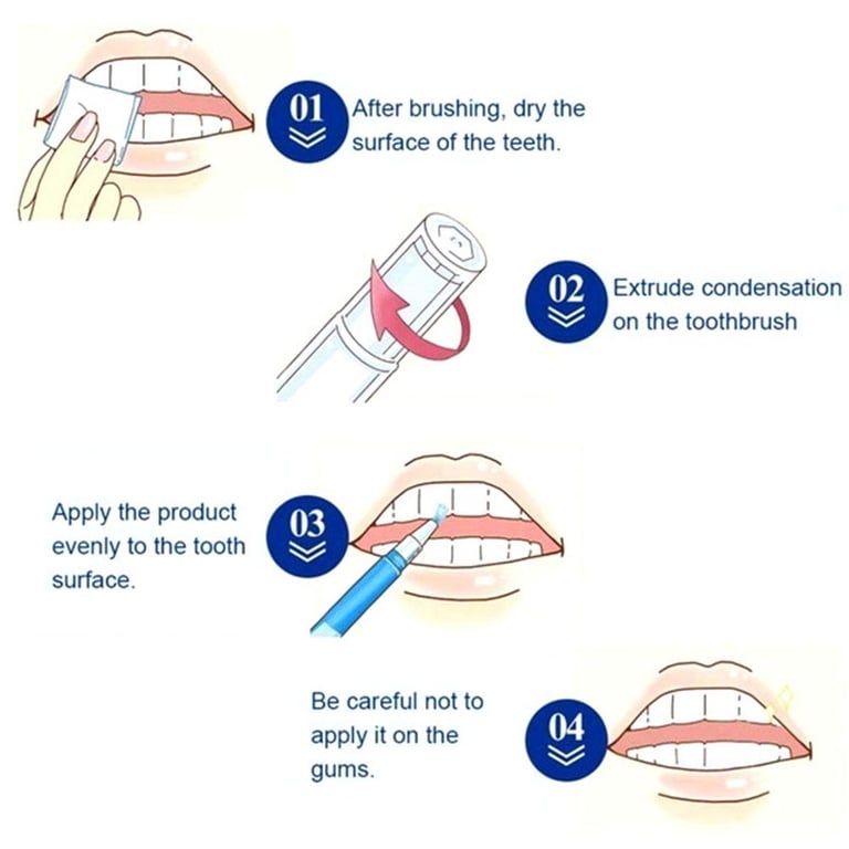 \nAfter cleaning the teeth, remove the cap and rotate the end of the whitening pen until the essence overflows onto brush head. Then apply the product on the teeth evenly and rinse it with clean water after 15-20 minutes, we recomend to use 2-3 times per week.