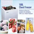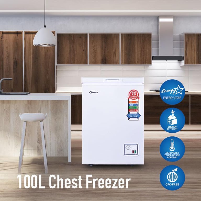 A Chest Freezer contain 20% more usable space, is typically quieter and the temperature inside stays constant throughout the entire interior compared to an upright freezer. A Chest Freezer uses less electricity and is more energy-efficient. During a blackout, a Chest Freezer will keep your food frozen longer than an upright freezer. And cleaning is also much easier, as there's a built-in-drainage hole at the bottom of the interior compartment. The 100L Chest Freezer PPFZ100, available in white or black, is equipped with a powerful compressor. Food is frozen within minutes of being placed in the Freezer, sealing nutrients and retaining flavours of food.