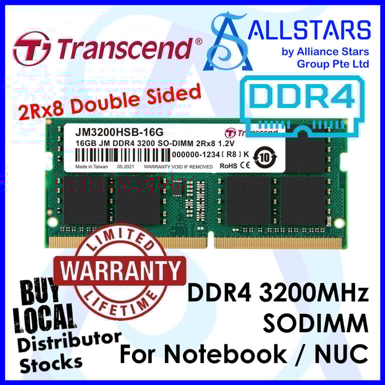 (ALLSTARS : We are Back / DIY RAM PROMO) Transcend 16GB DDR4 3200MHz SODIMM / 2Rx8 (JM3200HSB-16G) or 1Rx8 (JM3200HSE-16G) JetRAM / RAM for Notebook / RAM for NUC / RAM for Mini PC (installation is not included) (Warranty Ltd Lifetime with Convergent)