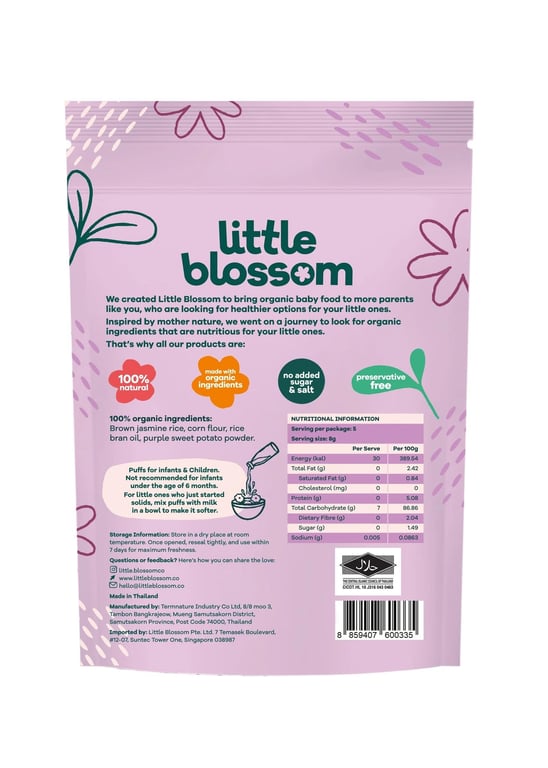 Little Blossom's brown rice puffs are the perfect on the go snack for your baby! Our puffs are 100% natural, made with organic ingredients, contain no added sugar, salt or preservatives and are gluten-free.Also available in: Apple Broccoli Pumpkin Strawberry