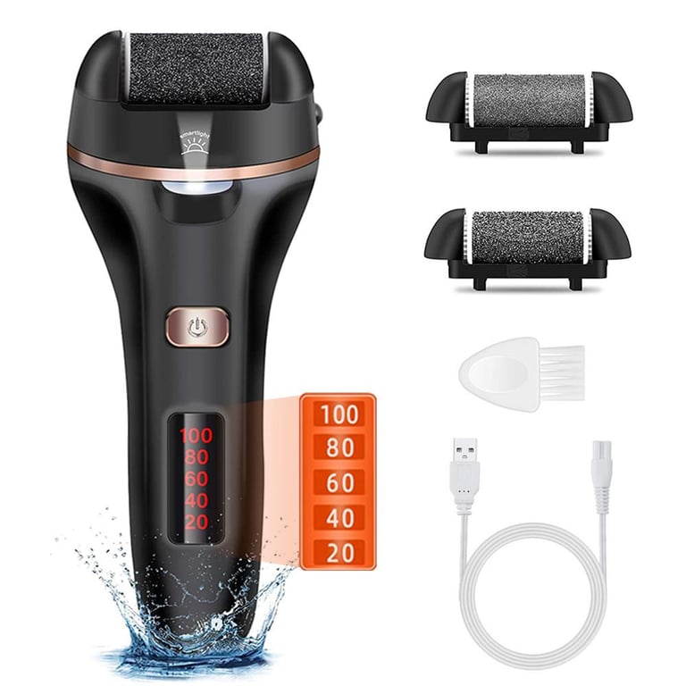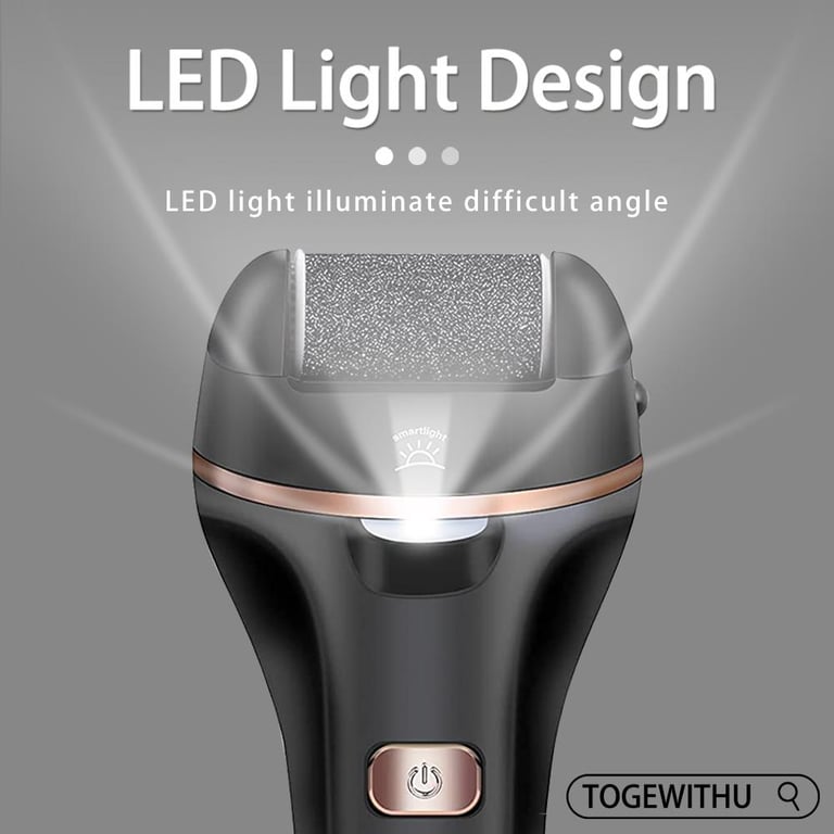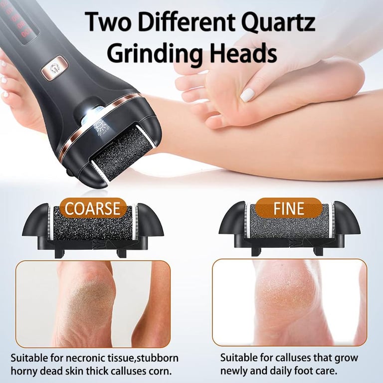 - LED Light and 2 different roller heads: LED Light design illuminate difficult angle. We have 1 fine roller head and 1 coarse roller head in this set. Meet all your callus removing needs. Refillable coarse roller head that spins 360 degrees for quick results on thick, calloused skin.