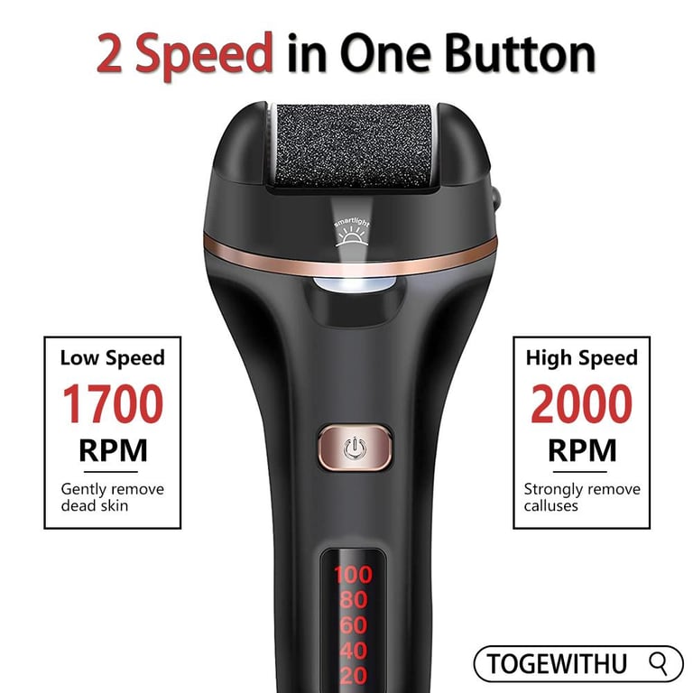 - 2 Speeds adjustable and safety: 1700x/min when low speed and 2000x/min when high speed. Low speed is suitable for the callus of hands and more delicate skin care. High speed is suitable for stubborn thick callus and dead skin. You are free to choose the speed you need! If the pressure is too strong,it will automatically stop working and avoid damage to the healthy skin.