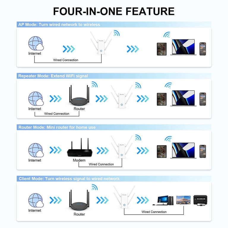 \n - Please choose the mode that suits you, AP mode turns your wired network into wireless connection; repeater mode enhances your network.